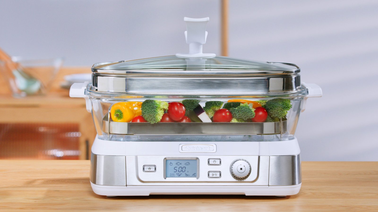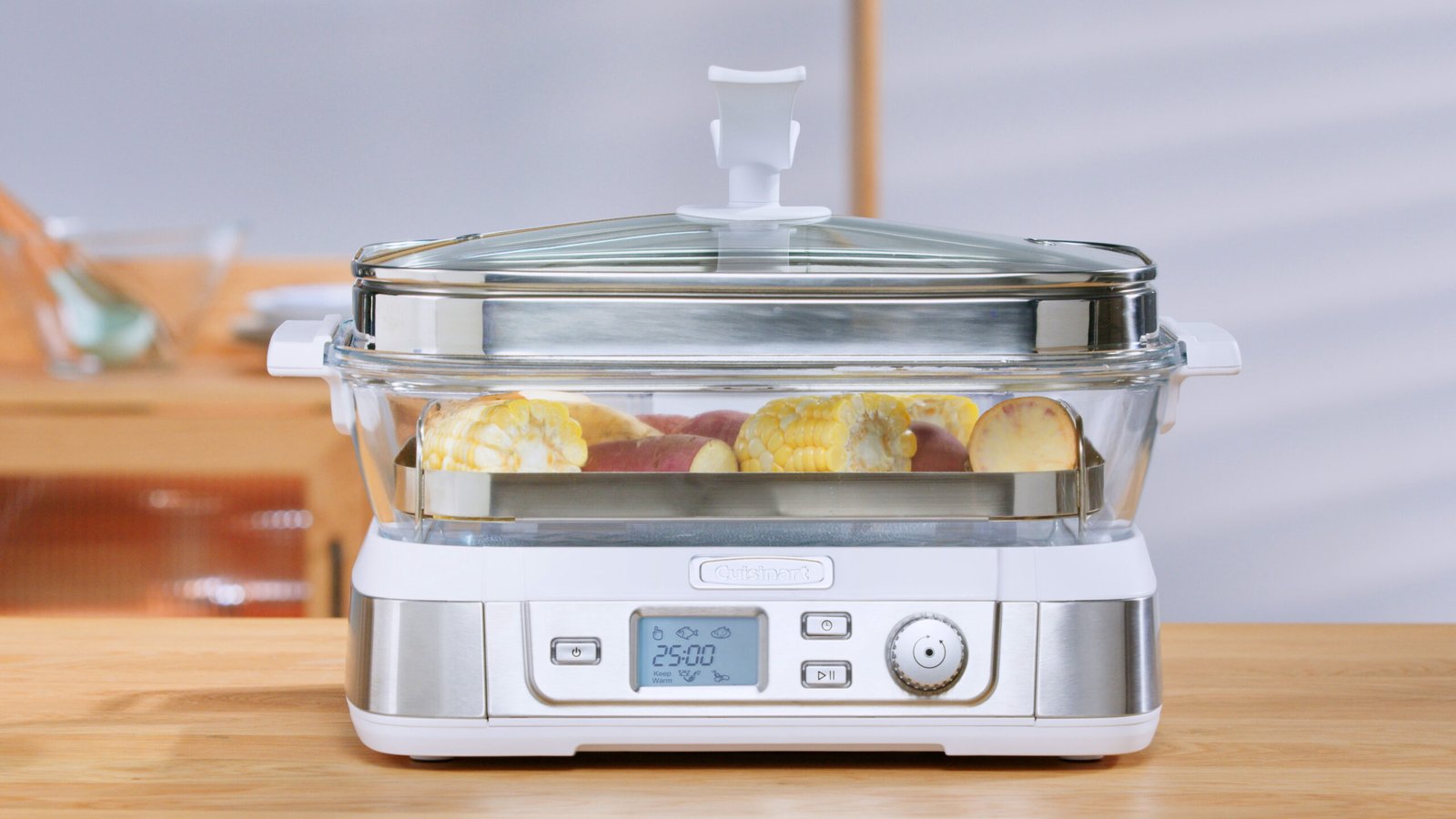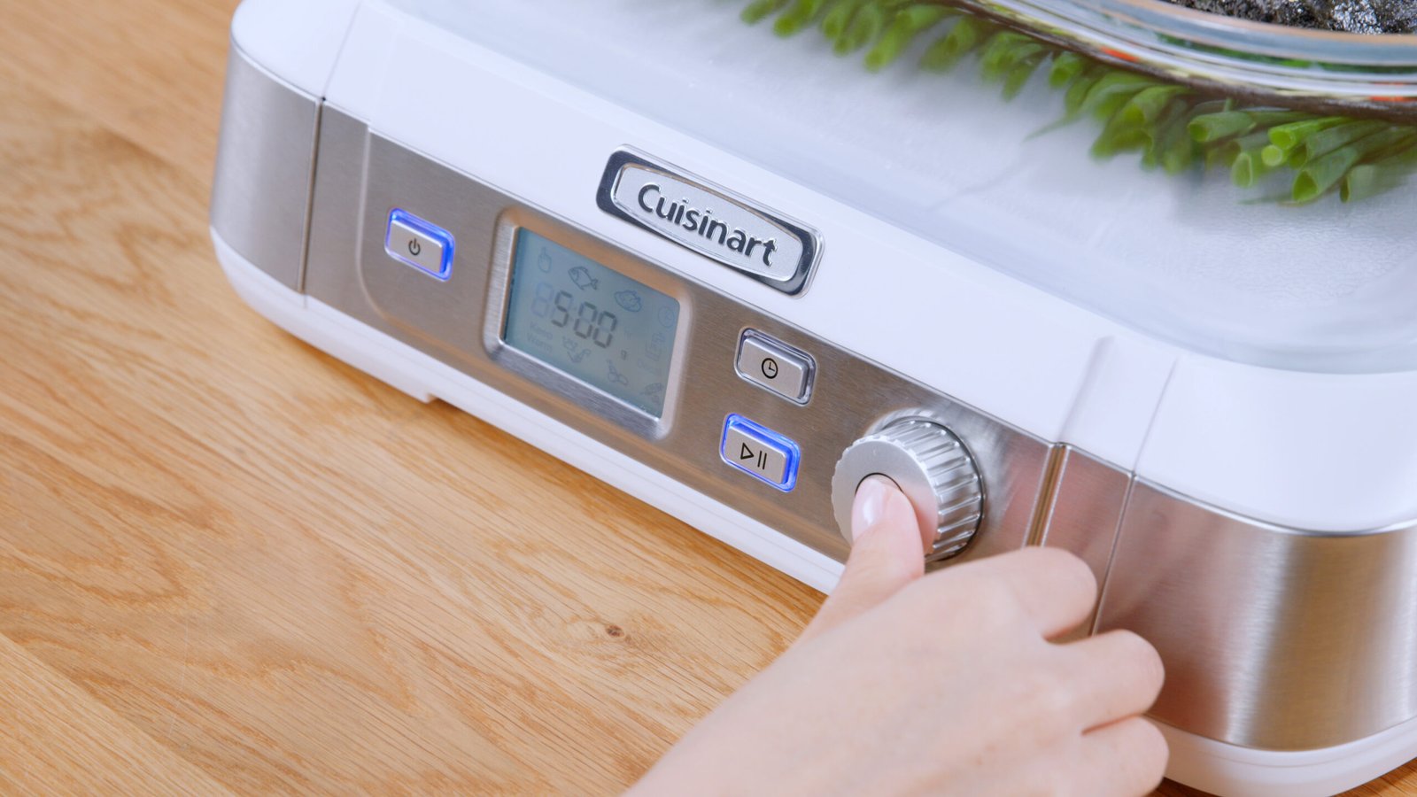 -7 pre-programmed settings – fish (default by weight), seafood, poultry, grain, vegetables, manual and keep warm
