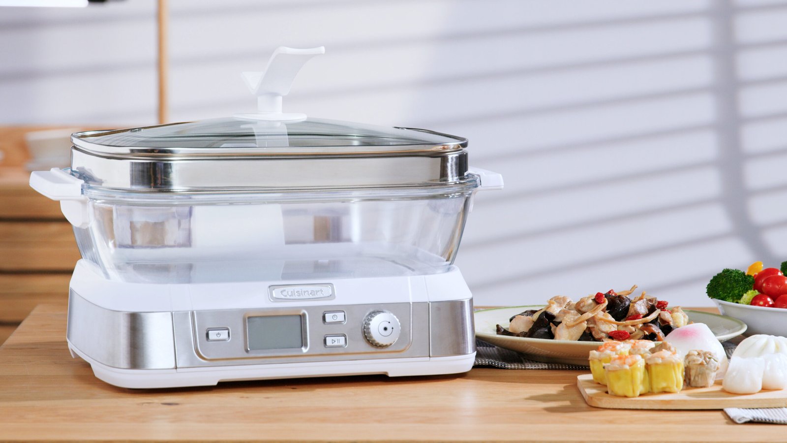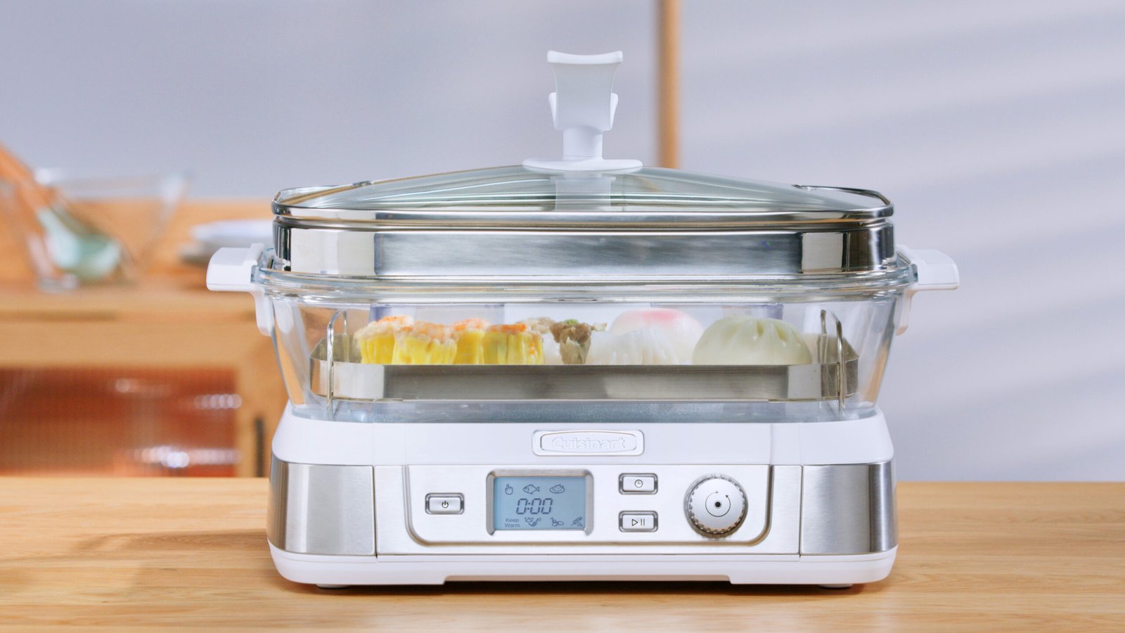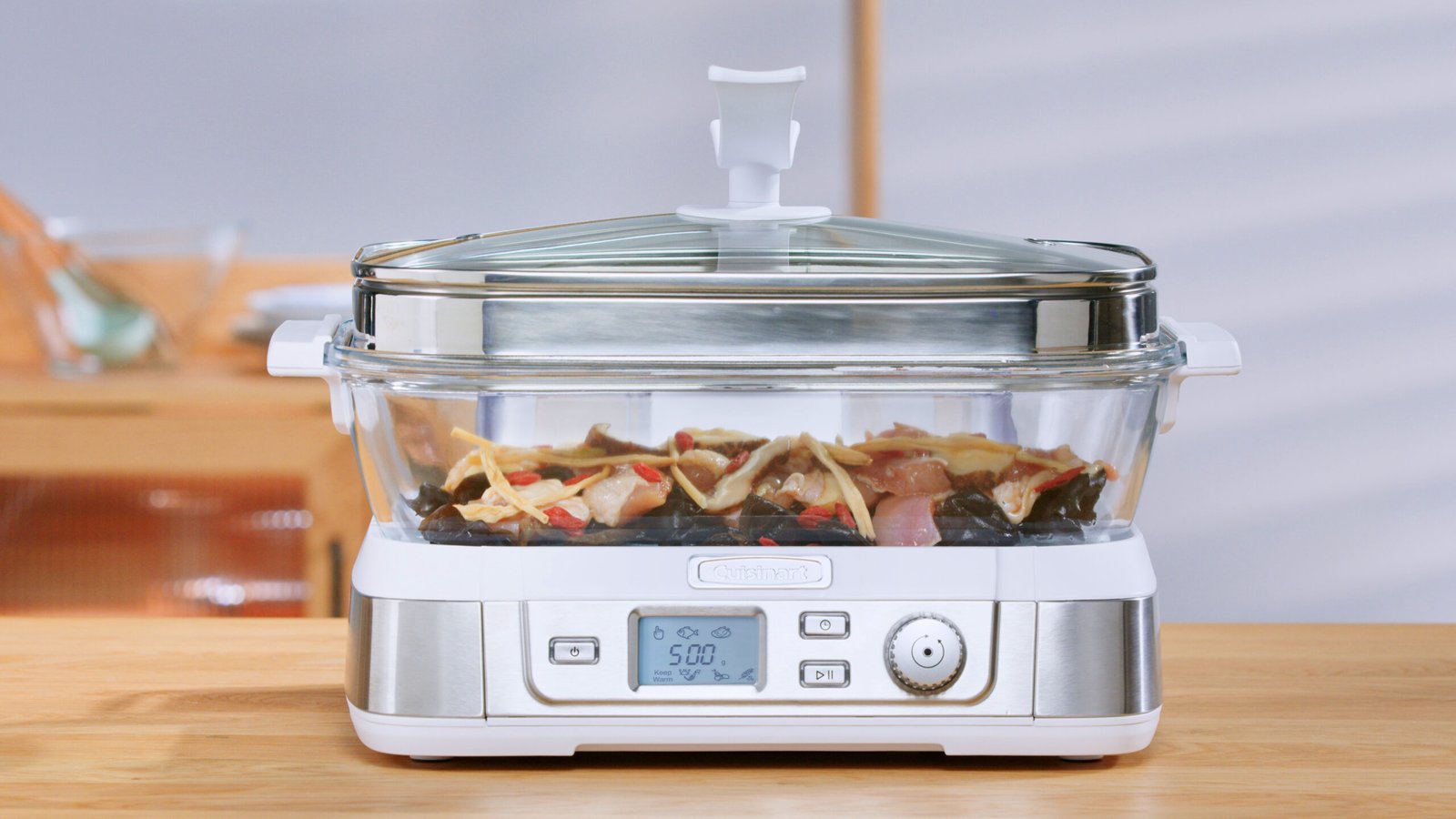 -7 pre-programmed settings – fish (default by weight), seafood, poultry, grain, vegetables, manual and keep warm